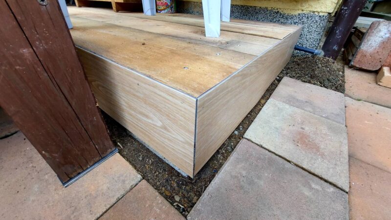 タッカーとボンドで、テラスの側面にフロア材を張ります。