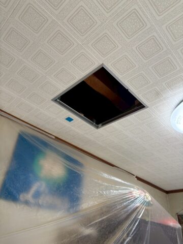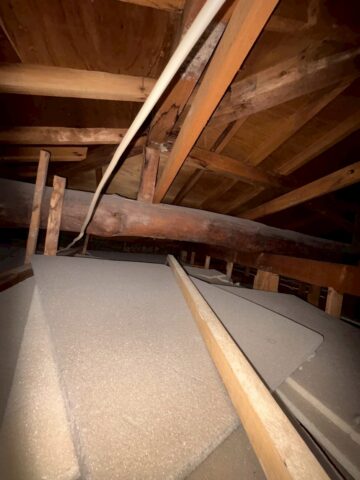 点検口から天井に入ります。奥に丸太梁が見えますね。薄いものの断熱材は既に入っておりました。