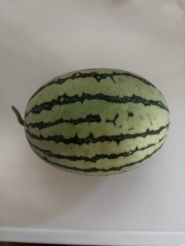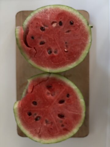 包丁を入れると、中はきれいな赤色。みずみずしく、驚くほど甘い!皮の白い部分まで、しっかり頂きました。