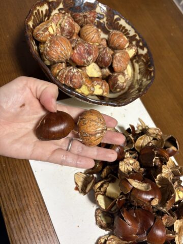 半日ほど水に浸した栗。鬼皮を剝いていきます。いい感じで剥けました。