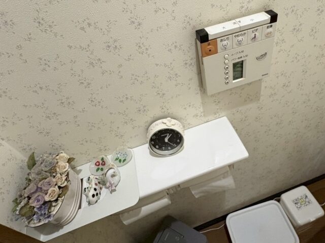 新調した棚付き2連紙巻き器。便器と同色のピンク色がかわいいです。