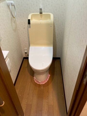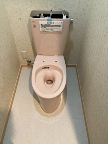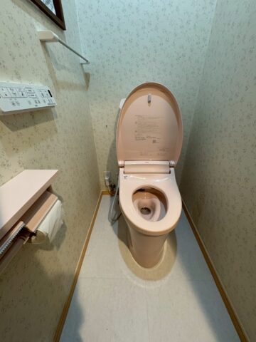 ピンクの便器と白の床材。S様にお似合いのかわいらしいトイレに生まれ変わりました。