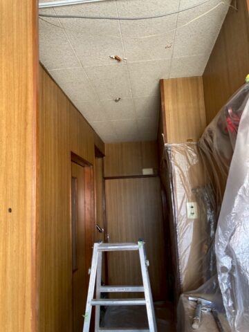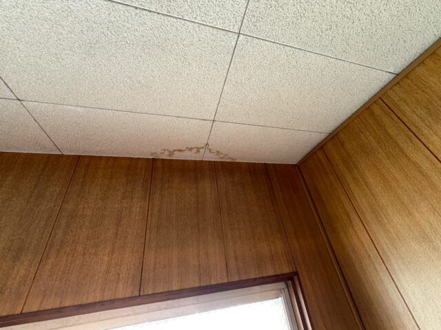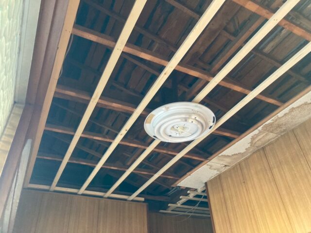 天井のあちらこちらに、雨染みが現われています。庇の修繕後、天井の修繕工事がスタート。