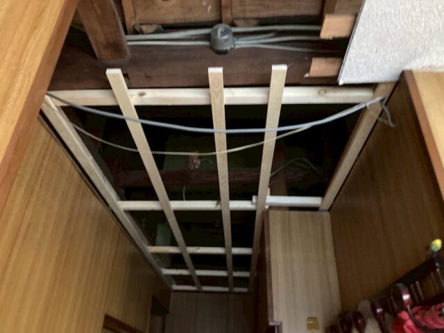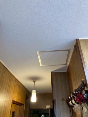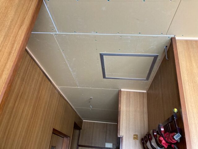 合板を張り、クロスで仕上げました。点検口を設けたので、今後、天井裏の点検もしやすくなります。
