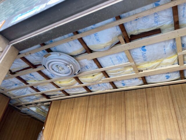 下屋根の下になる部分のみ、断熱材を敷き詰めます。