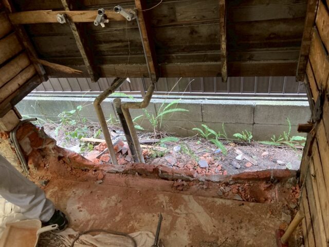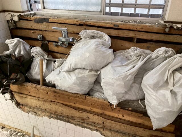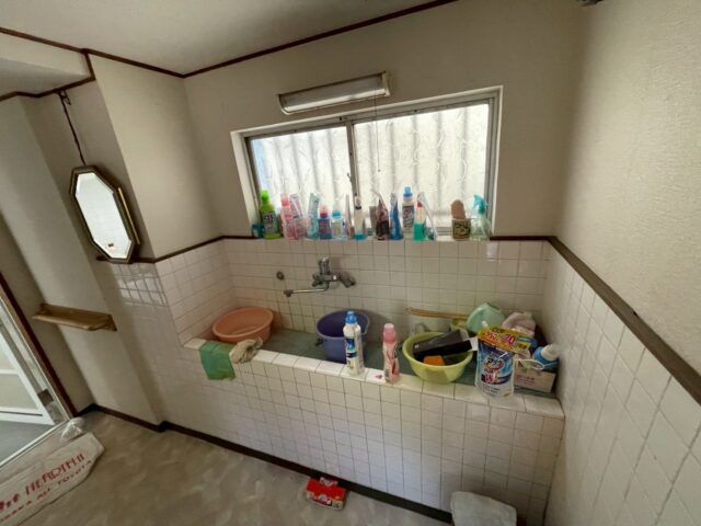 タイル張りの洗面台・外壁・サッシを解体していきます。