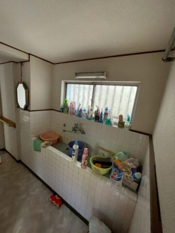タイル張りの洗面台・外壁・サッシを解体していきます。