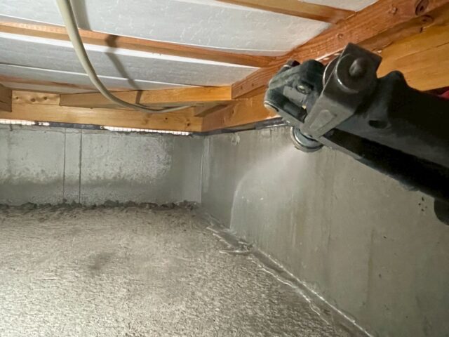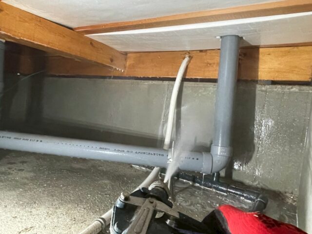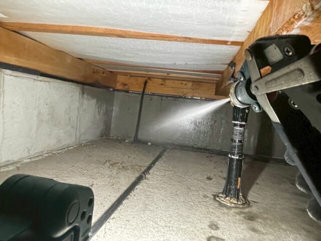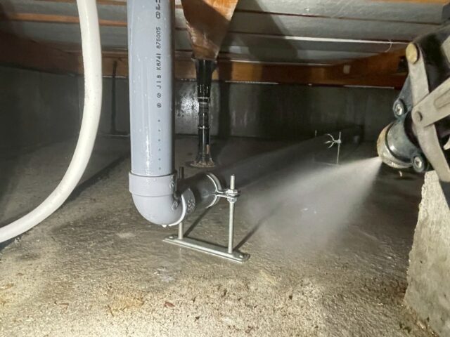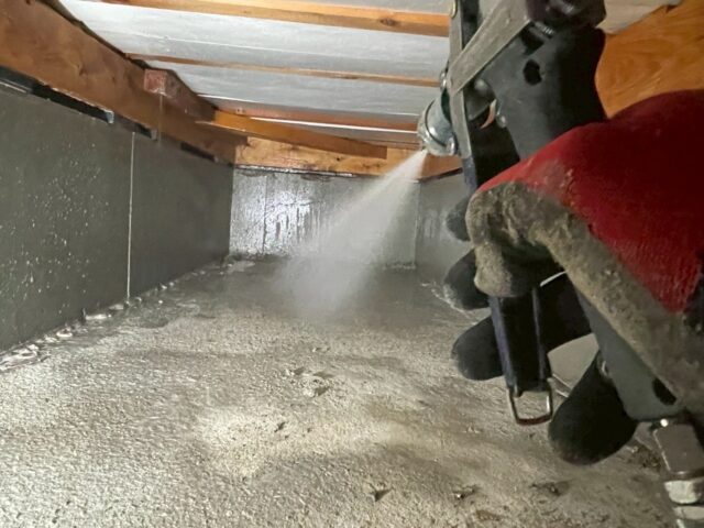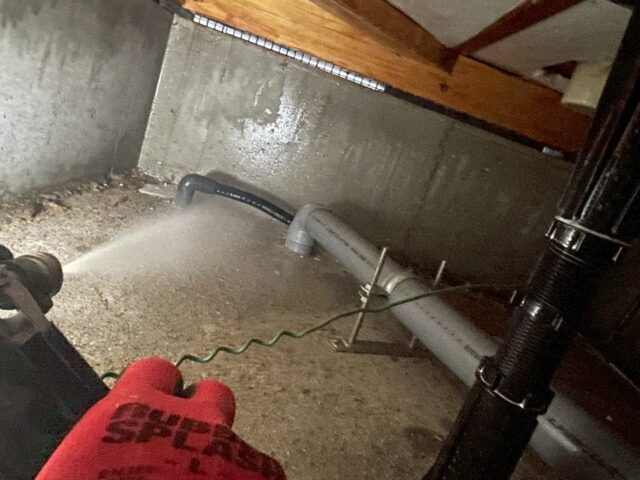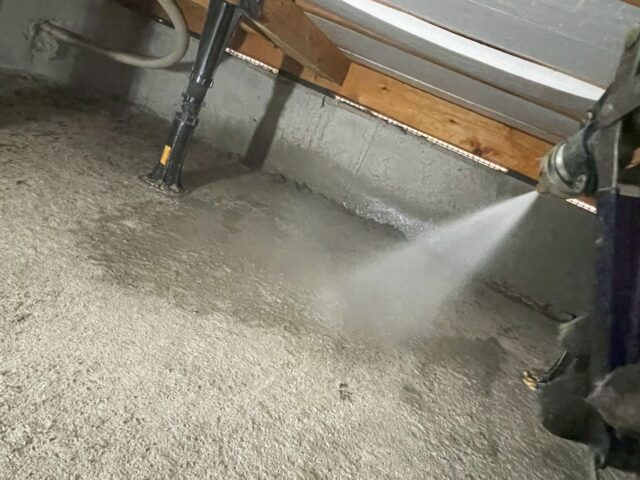 湿気が多くシロアリが好みやすい床下。隅々まで、薬剤を散布していきます。
