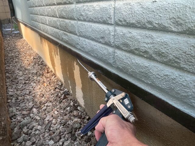 続いて、外側は、基礎パッキンの隙間から薬剤を注入。