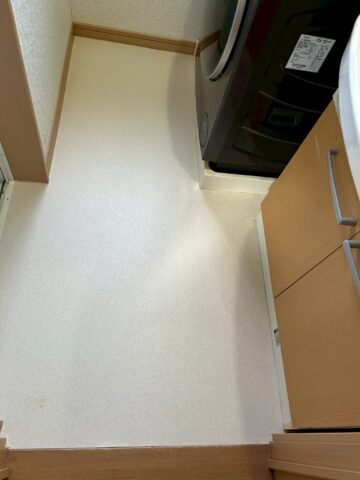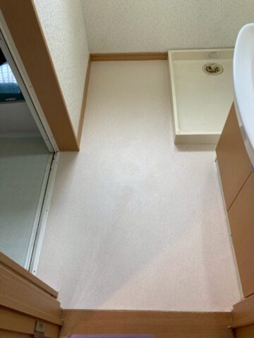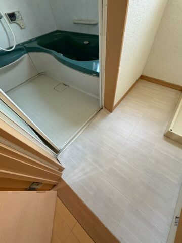 洗面脱衣室のクッションフロア。浴室入り口付近のクッションフロアが浮きはがれています。
