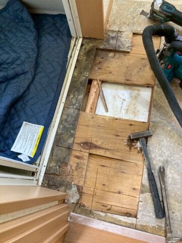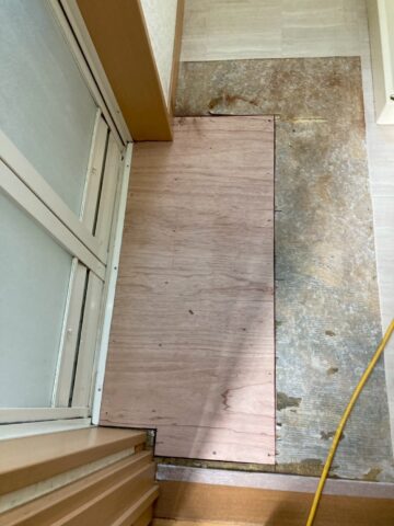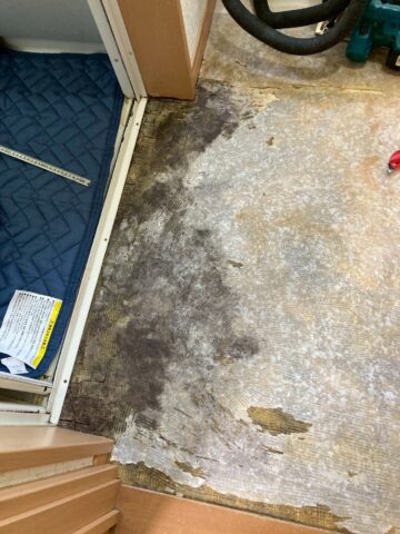 クッションフロアをめくると、床材の傷みが現れました。