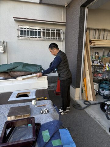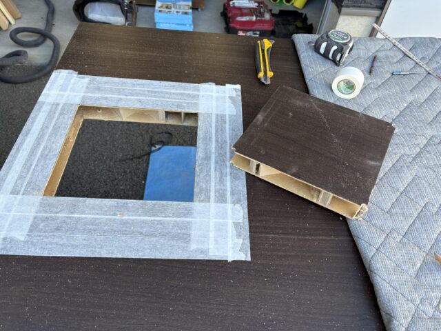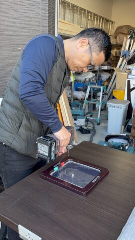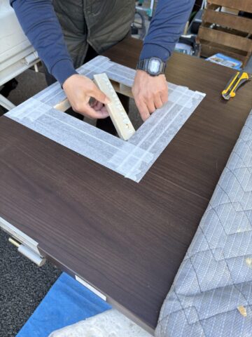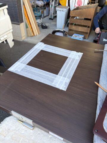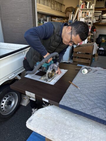 電動丸ノコでドアを切断。細部はのこぎりを使用し、綺麗に切り抜かれました。