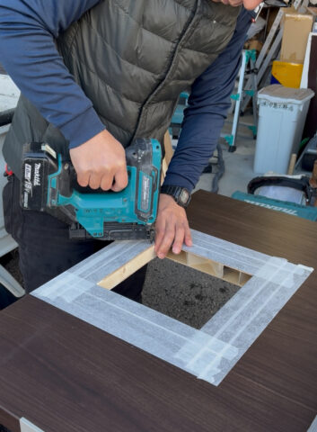 そんな空洞部分に木材を埋め込み、タッカーを利用しホチキス状の針で固定します。