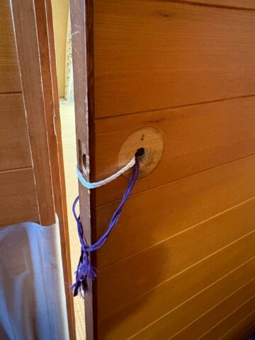 ドアノブが取れた寝室のドア。丸座の穴に紐を通して端を結ぶことで、簡易的な把手になっています。