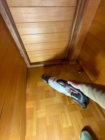 ドア周辺には、木くずが飛んでいますので、最後にお掃除を行います。