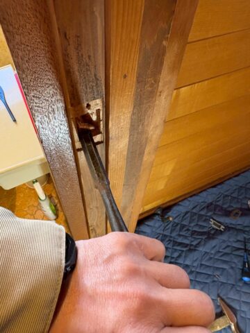 ノブを取り付けられるよう、ドアの側面にノミと電動工具で作業しています。