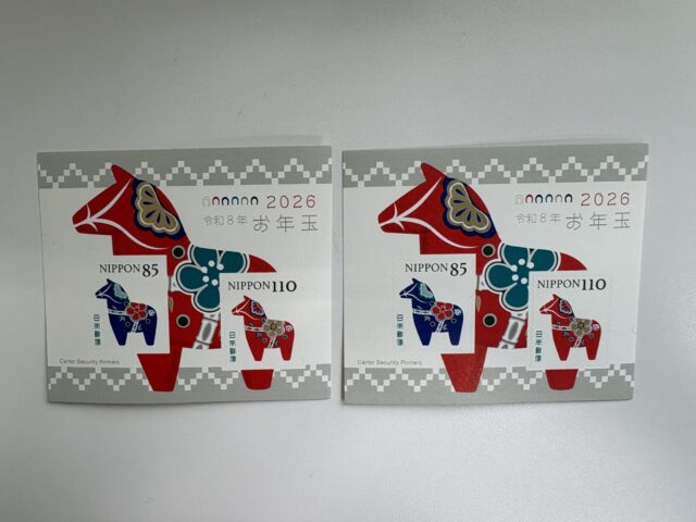 今年の切手は馬型のかわいい置物に、松竹梅の模様があしらわれたオメデタイデザインです。