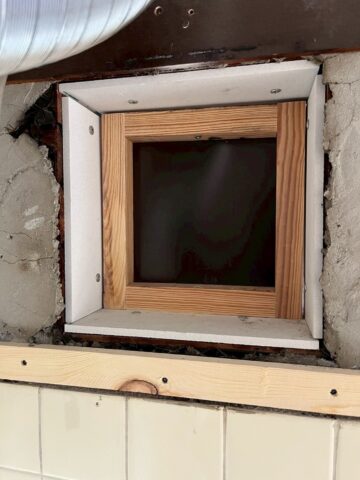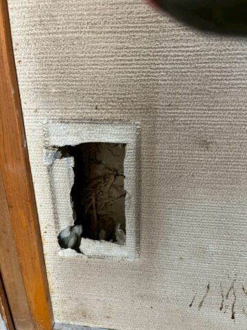 換気扇を取り付けるために、ダクトを通す作業を行っています。