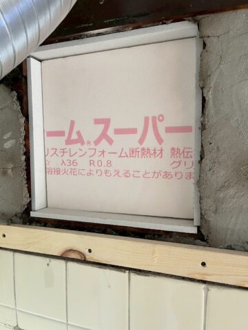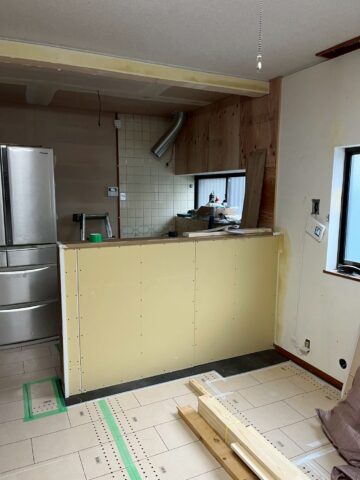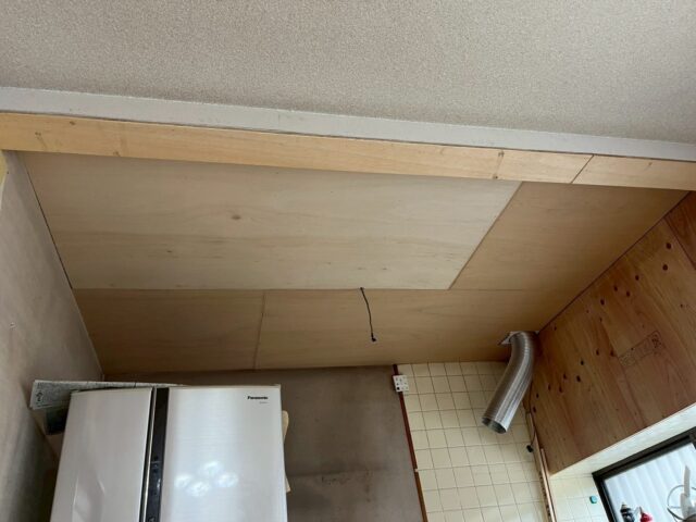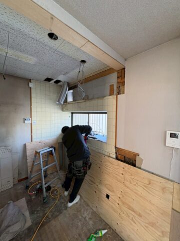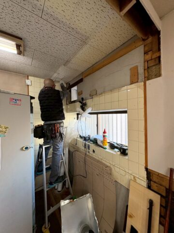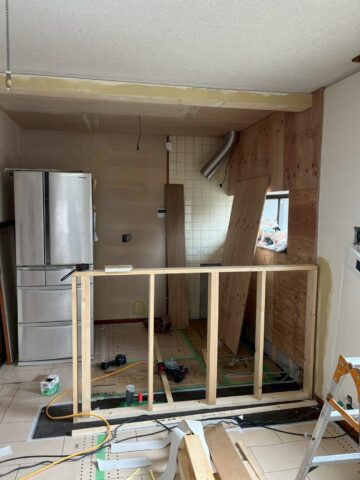 ダクトが取り付けらえました。続いてシステムキッチンを取り付けるために壁に下地を張ります。