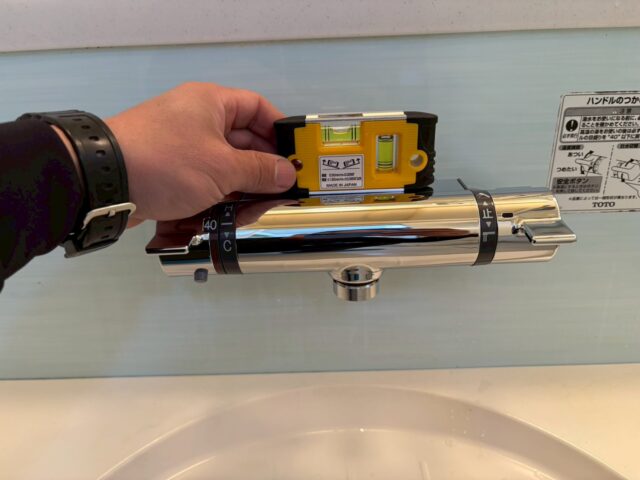 水栓がまっすぐ取り付けられているかを、水平器の中の気泡見て確認します。