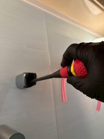 作業開始。先ずはシャワーホースを取り外し、水栓金具を撤去します。