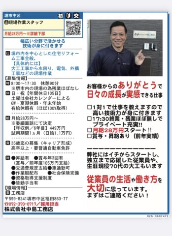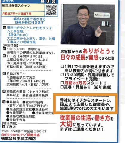 只今、中島工務店では【現場スタッフ】を募集中です。