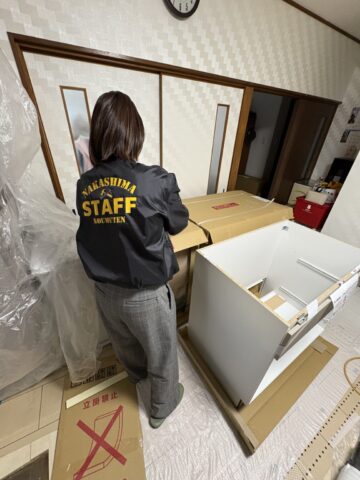 キズが付かないよう丁寧に段ボールを開封したり、取付の際の補助をしたり。