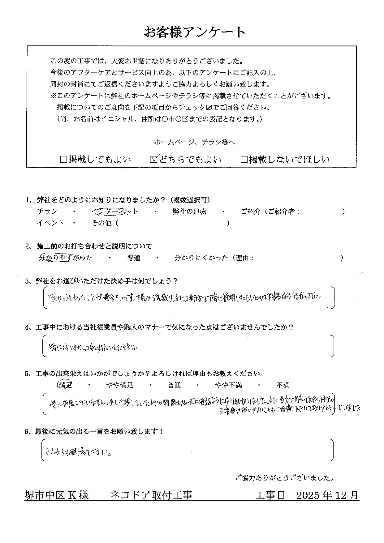 特に問題ございません。少し干渉していたドアの開閉もスムーズに行えるようになり助かりました。また、当方が用意したキャットドアの目暗板が取れやすいこともご指摘いただいてありがとうございました。