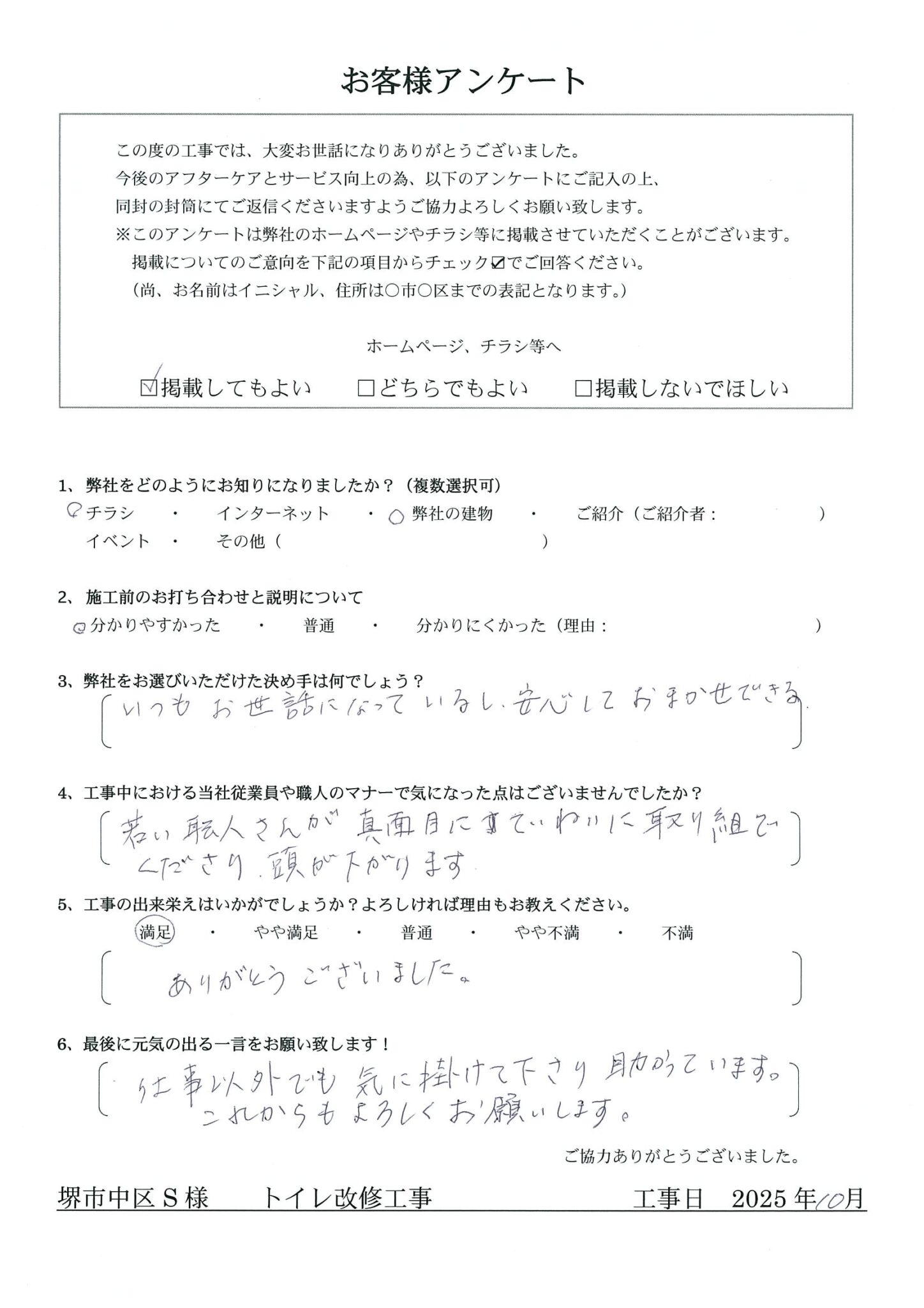 - Q.工事中における当社従業員や職人のマナーで気になった点はございませんでしたか?