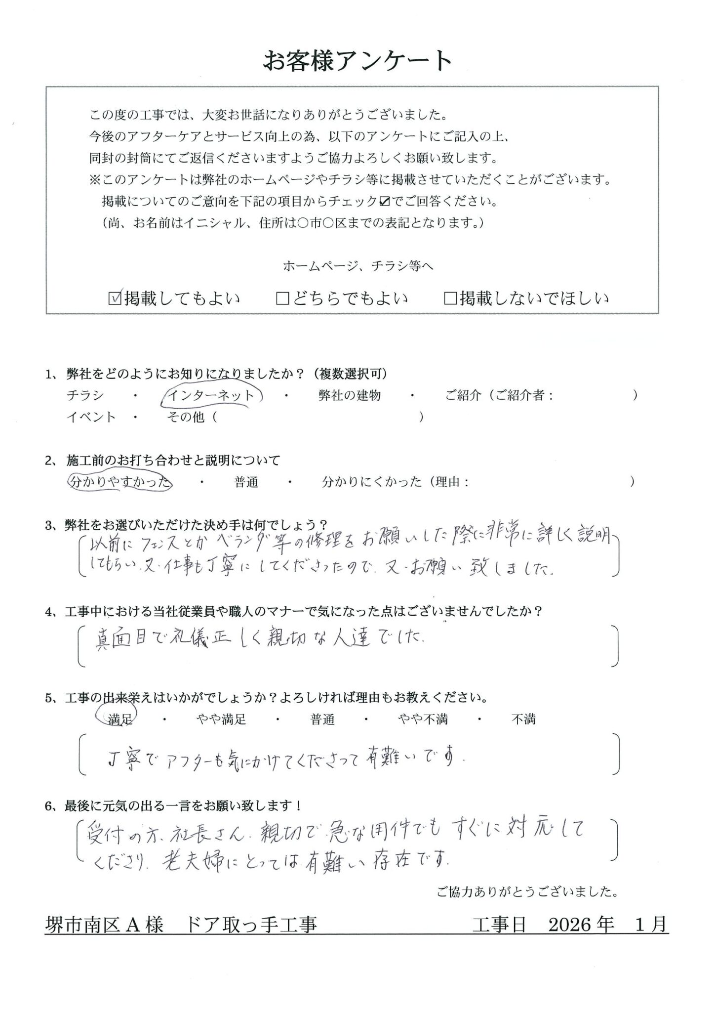 - Q.工事中における当社従業員や職人のマナーで気になった点はございませんでしたか?