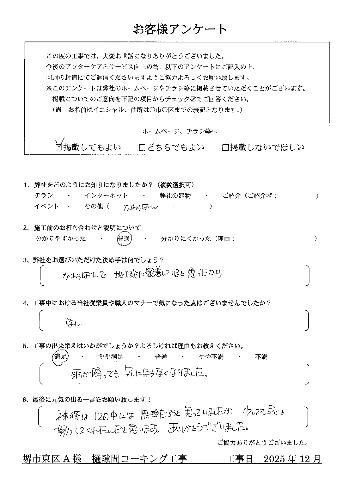 Q.工事の出来栄えはいかがでしょうか?よければ理由もお教えください。