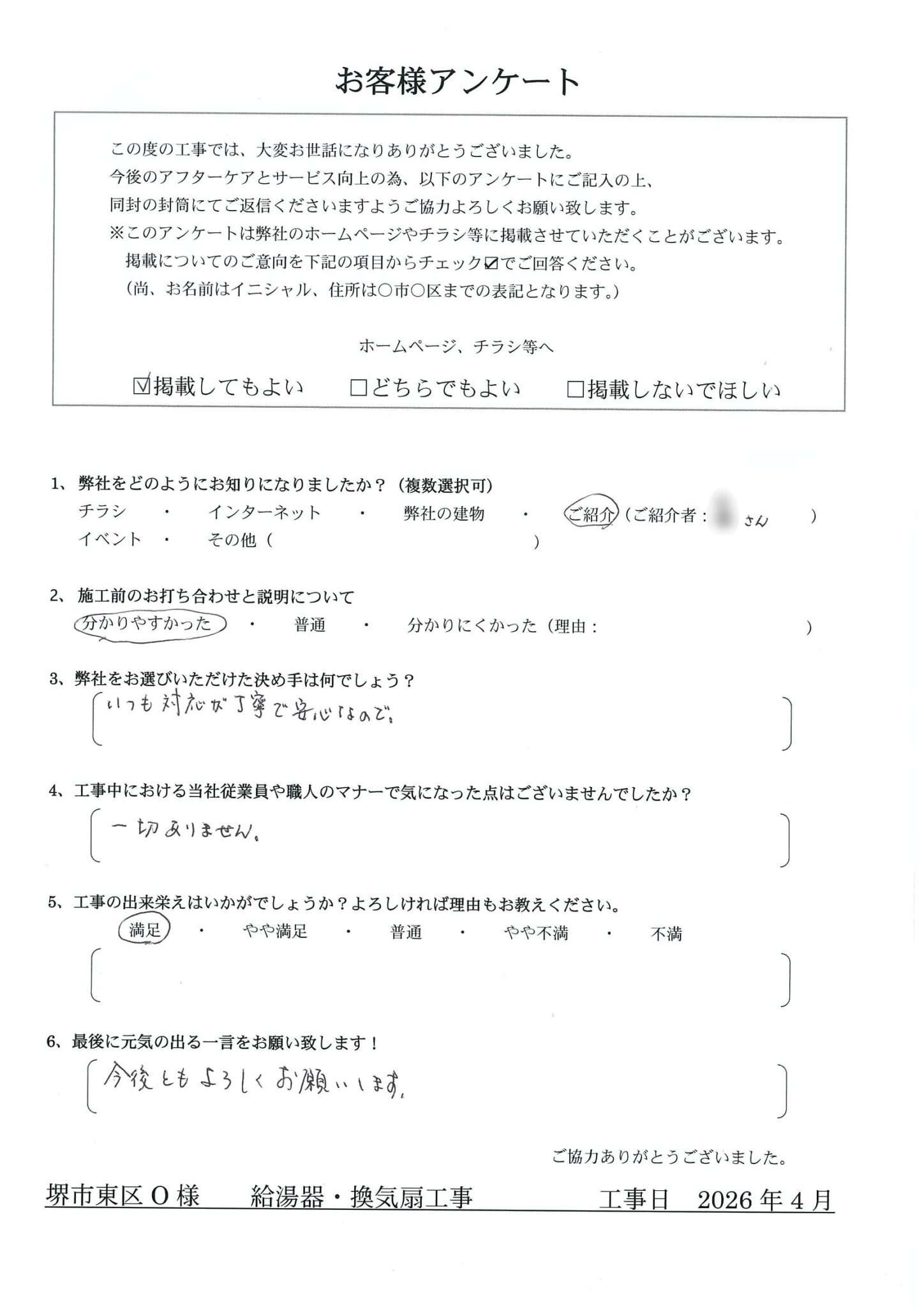 - Q.工事中における当社従業員や職人のマナーで気になった点はございませんでしたか?