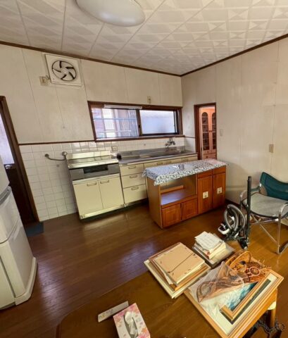 壁付けのキッチン設備の横には勝手口。今はお使いではない家具も少々ございます。