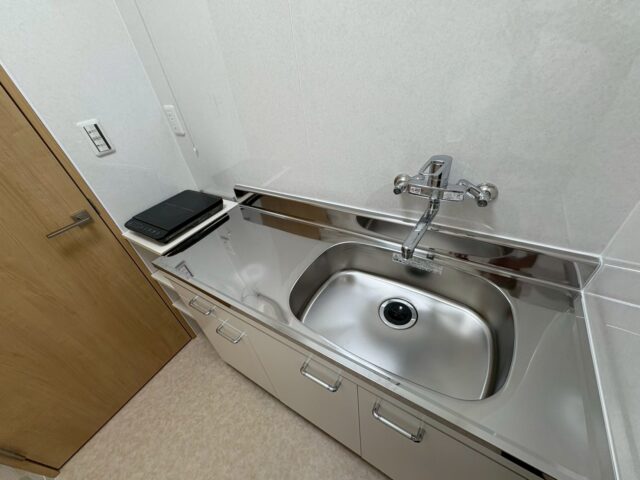 不要な家具を処分し、床を整え、シンプルなキッチン設備【ニッサンハロー 一槽流し台】、水栓、IHコンロを取り付けました。