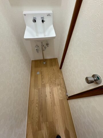階段の右側を進めば、トイレと手洗いがあります。ところが、LDKのドアが外開きで行く手を遮るため、トイレに行くのがちょっぴり面倒です。