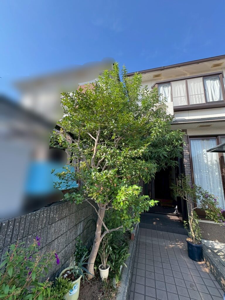 2025.10.10屋根や水栓の工事を承ってきたM様より、「木が大きくなっだんだけど、自分では切れなくて」とご相談をお受けしました。