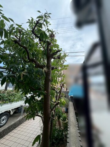 2025.10.10屋根や水栓の工事を承ってきたM様より、「木が大きくなっだんだけど、自分では切れなくて」とご相談をお受けしました。