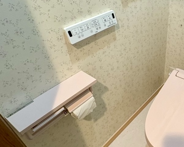 新調した棚付き2連紙巻き器。便器と同色のピンク色がかわいいです。
