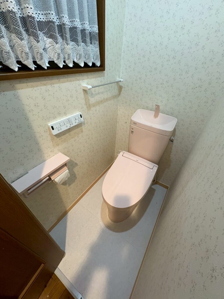 ピンクの便器と白の床材。S様にお似合いのかわいらしいトイレに生まれ変わりました。