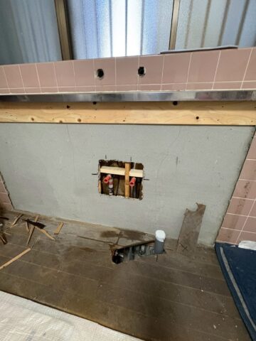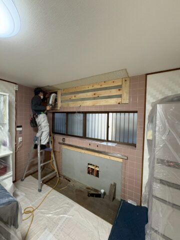 解体部分を補修し、かべの下地を造作していきます。新しいダクトをつなげていきます。