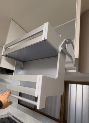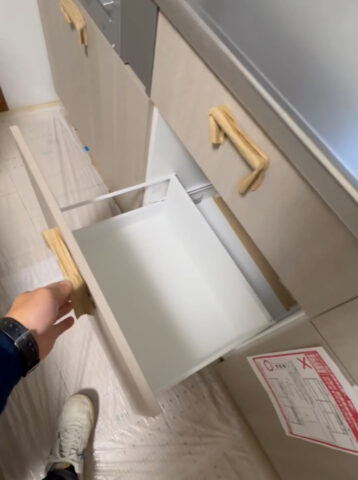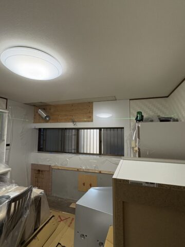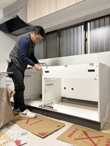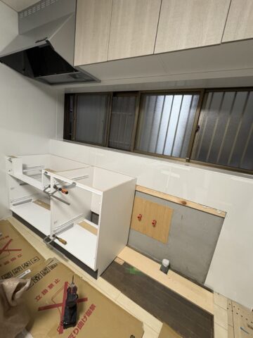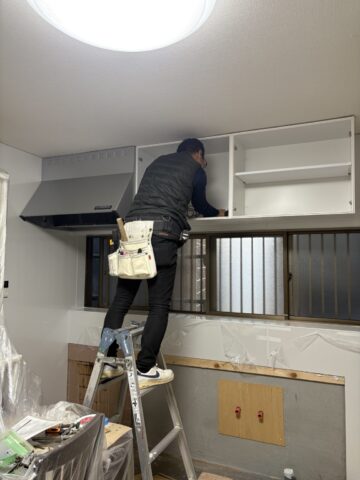 壁には掃除のしやすいマグネットキッチンパネルを張り、吊り戸棚を取り付けていきます。