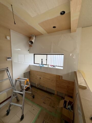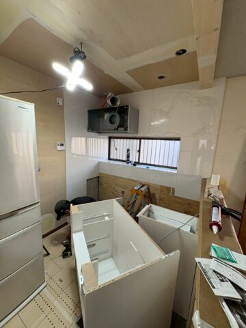 ダクトが取り付けらえました。続いてシステムキッチンを取り付けるために壁に下地を張ります。