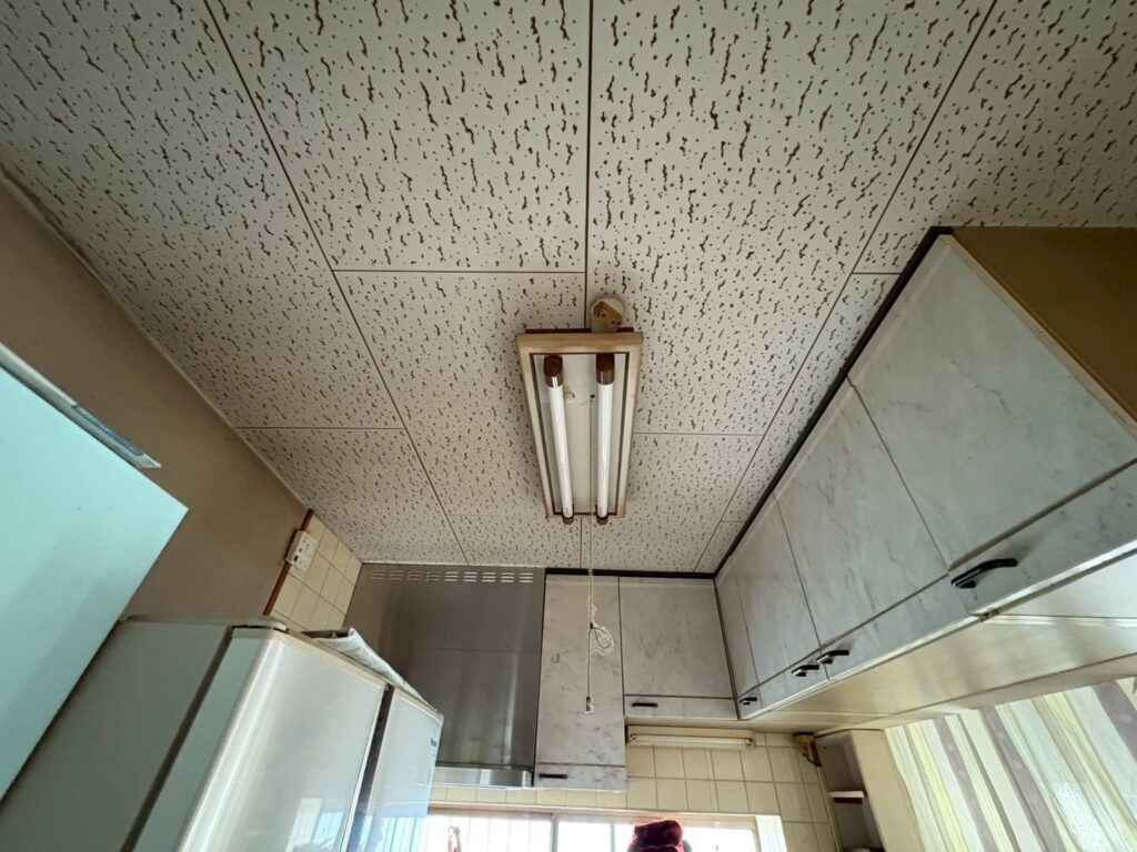 天井にはシーリングライトとダウンライトが設置されています。更に壁のクロスとキッチンパネルが白く、明るくなりました。