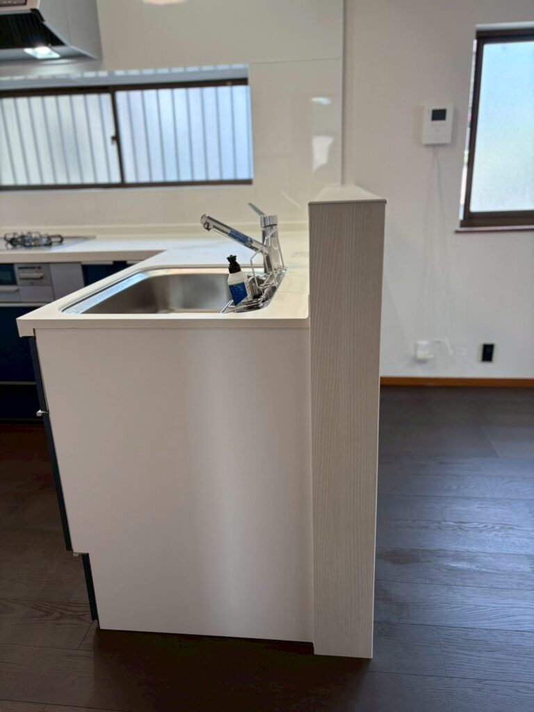 材料を冷蔵庫から出す→洗う→下ごしらえ→調理→配膳までが、数歩の距離で行えます。更に幅40cmあったキッチンカウンターが、奥行き15cmの腰壁になったので、ダイニングへお皿を渡すのも楽になりました。カウンターのぶんだけ、約20cmキッチンが広くなっています。