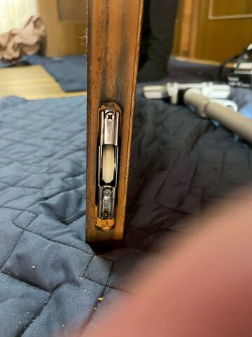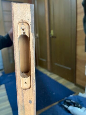 新しいレールは直付けレールで、以前の埋め込みレールより若干高くなるため、扉自体も調整しています。